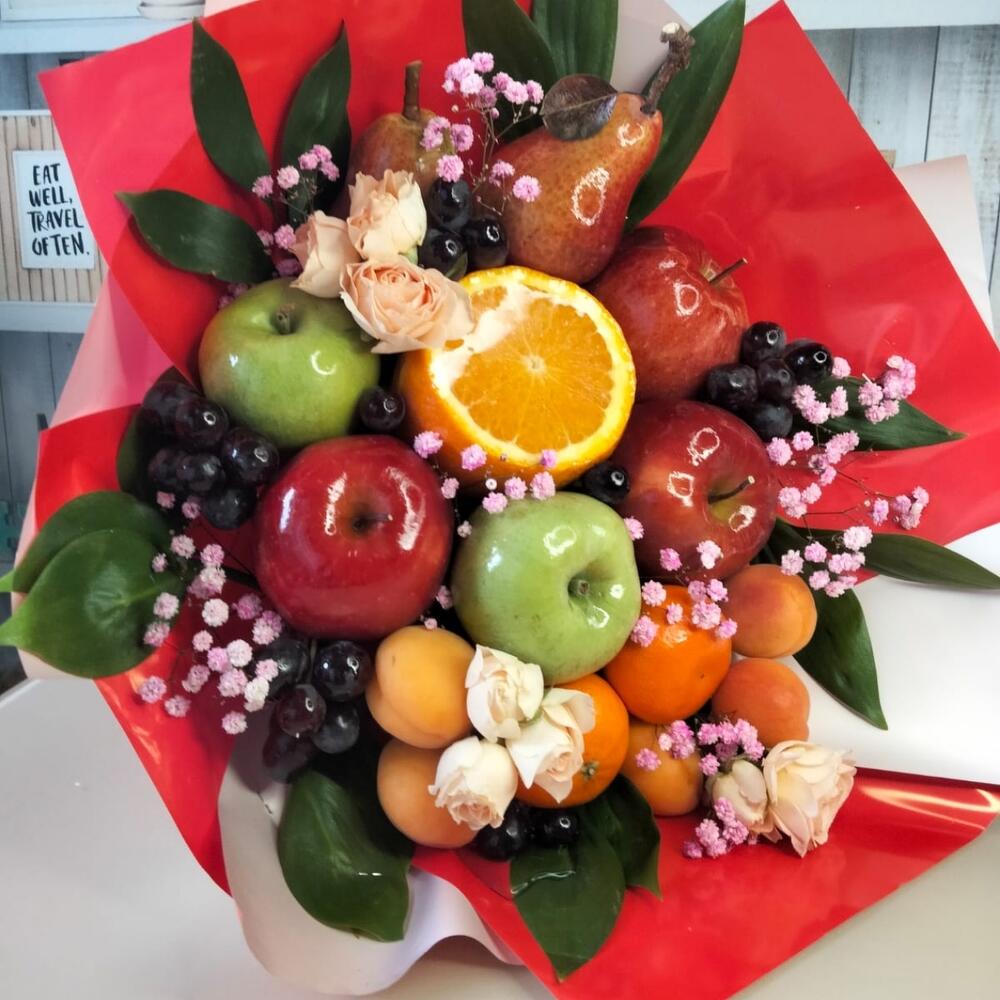 Гипсофила – 1 шт.Роза кустовая – 3 шт.Виноград – 200 гр.Апельсин – 1 шт.Мандарин – 2 шт.Груша – 2 шт.Слива красная – 5 шт.яблоко красное – 3 шт.яблоко зеленое – 1 шт.натуральная зелень – 1 шт.