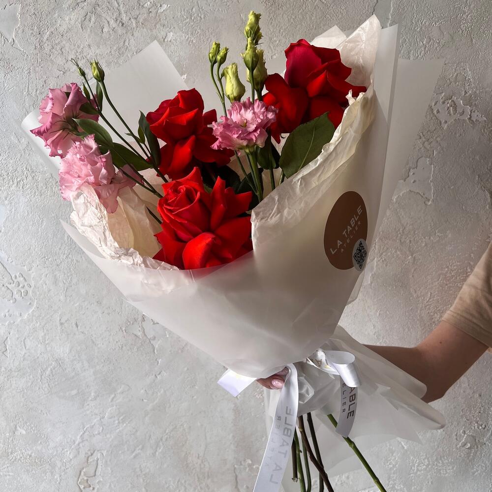Яркий букет с французскими розами и махровым лизиантусом