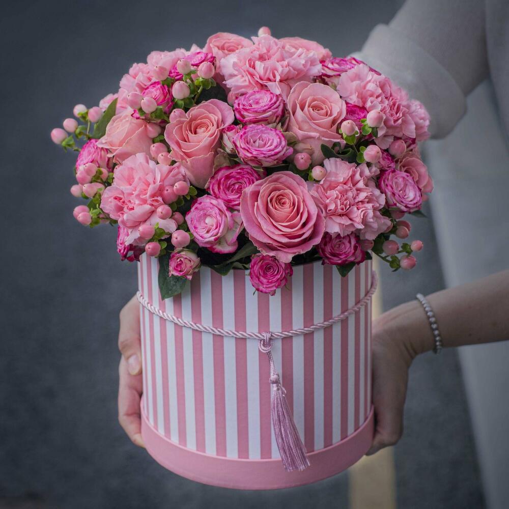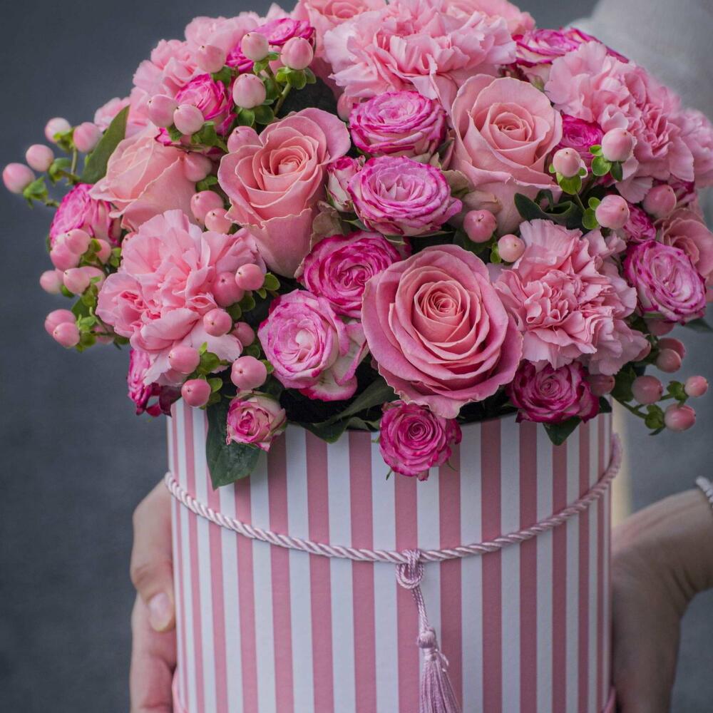 Роза кустовая – 5 шт.Гвоздика – 5 шт.Роза одноголовая – 7 шт.Хиперикум – 6 шт.Шляпная коробка – 1 шт.витаминная губка – 1 шт.