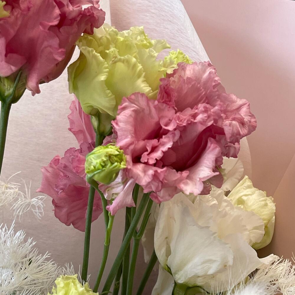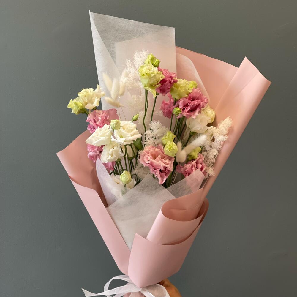 Букет из белых и розовых лизиантусов и сухоцветов "Нежное кружево"