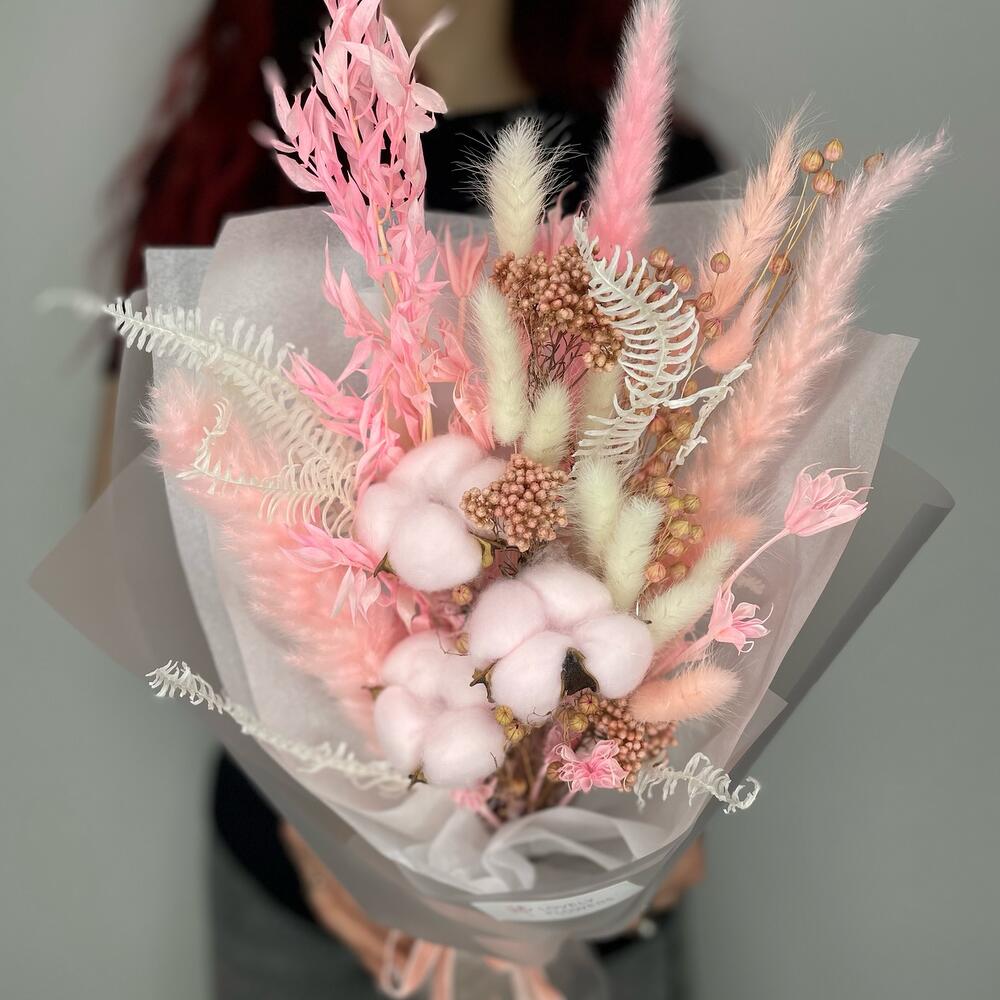 хлопок цветной – 3 шт.рускус стабилизированный – 1 шт.папоротник стабилизированный – 1 шт.озотамнус стабилизированный – 1 шт.Нигелла сухоцвет – 5 шт.лен сухоцвет – 11 шт.Лагурус – 11 шт.камыш сухоцвет – 3 шт.Упаковка дизайнерская – 1 шт.Лента – 1 шт.