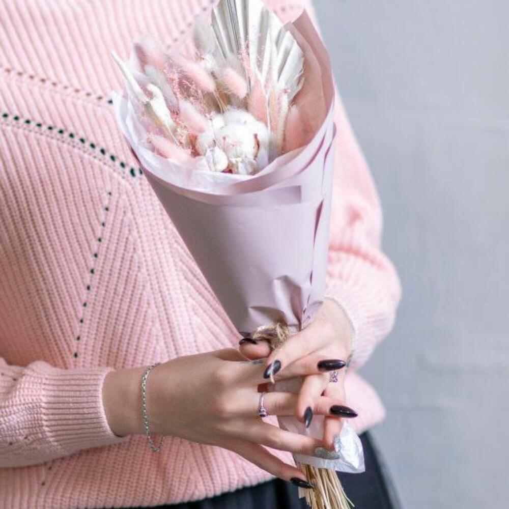 Хлопок – 1 шт.Лагурус – 2 шт.флеум – 1 шт.нигелла земляничная – 2 шт.Лист пальмы – 1 шт.гликсия – 1 шт.агростис – 1 шт.Дизайнерская упаковка – 1 шт.