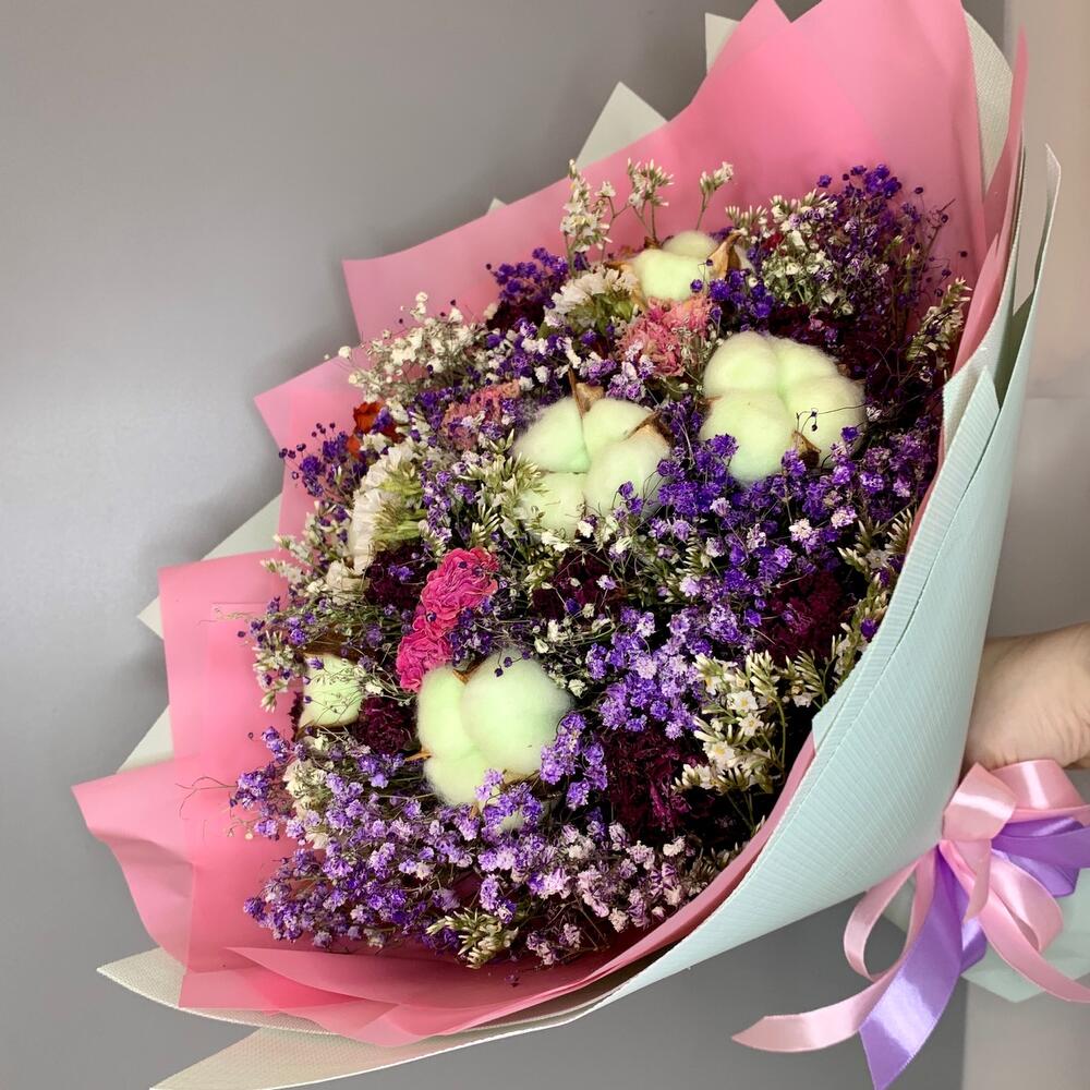 Букет из сухоцветов в лавандовых оттенках с хлопком