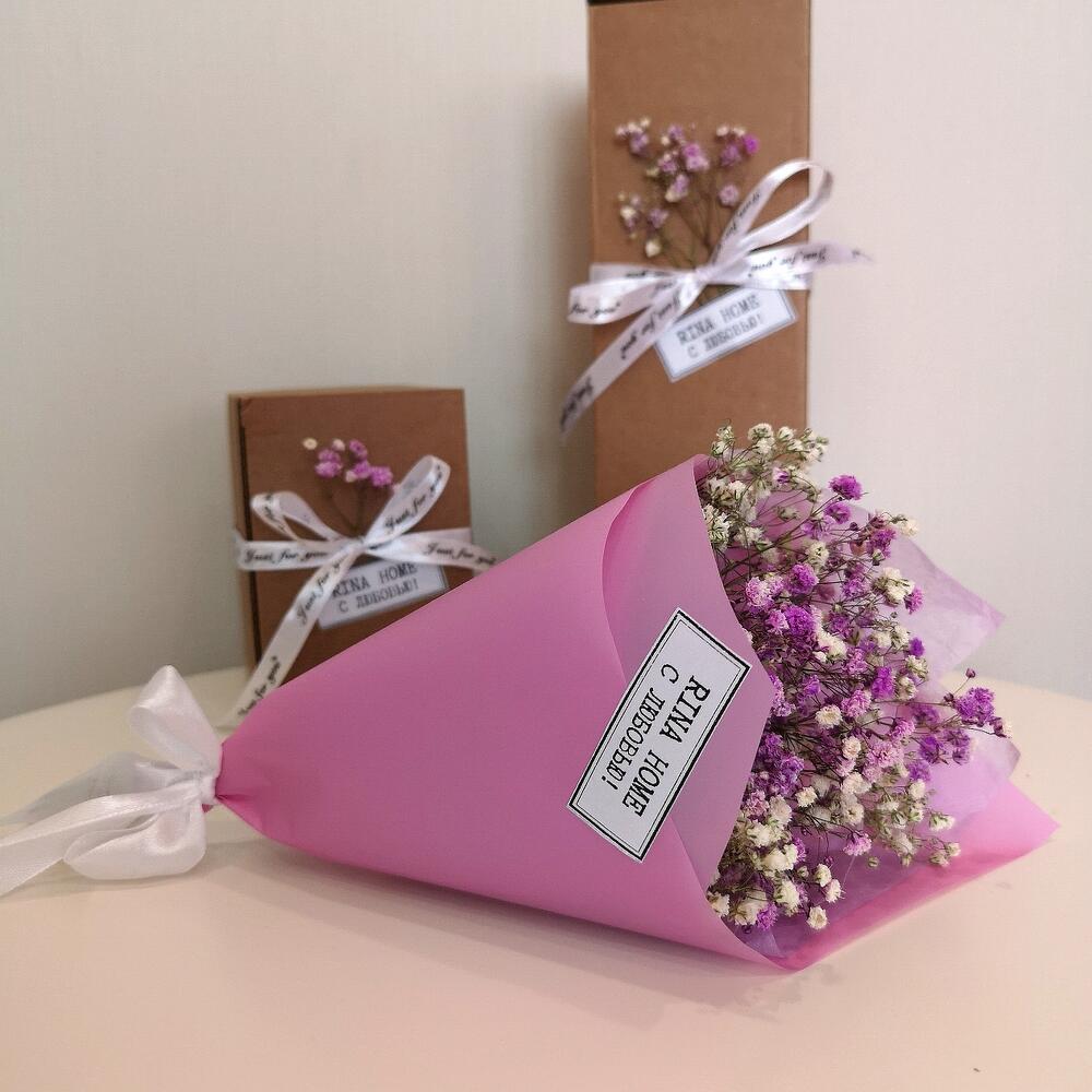 гипсофила сухоцвет – 2 шт.пленкой флористическая – 1 шт.Бумага тишью – 1 шт.Лента атлас – 1 шт.наклейка фирменная – 1 шт.