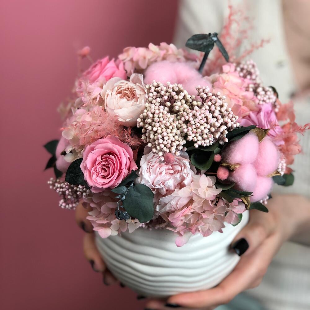 Композиция авторская из стабилизированых цветов. Ваза керамическое, размер вазы 10х13см.Не требует ухода и полива, срок жизни 5-7 лет при соблюдении рекомендаций.