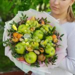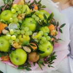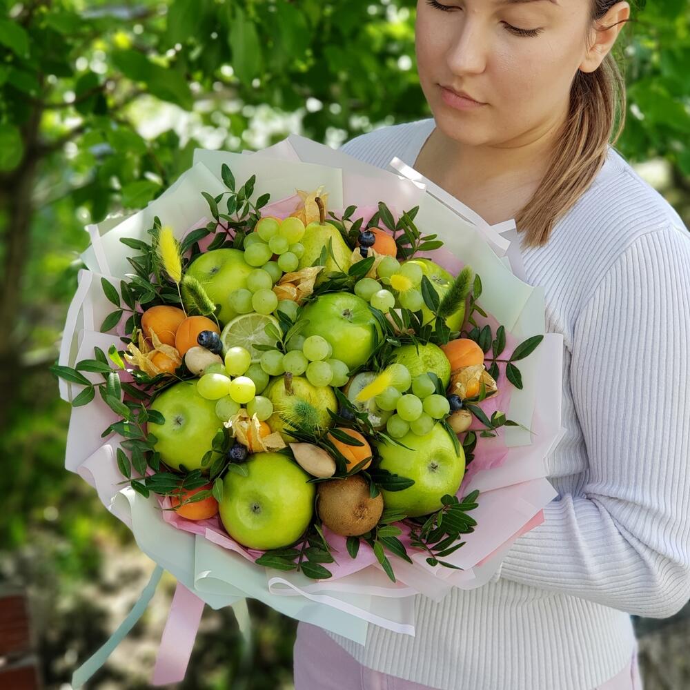 Виноград – 150 гр.Киви – 2 шт.Яблоко – 6 шт.Лайм – 2 шт.Физалис – 6 шт.Груша – 2 шт.Голубика – 15 гр.Лагурус – 5 шт.Транспортировочная коробка – 1 шт.Орех пекан – 5 шт.зелень фисташки – 3 шт.абрикос или мандарины – 6 шт.
