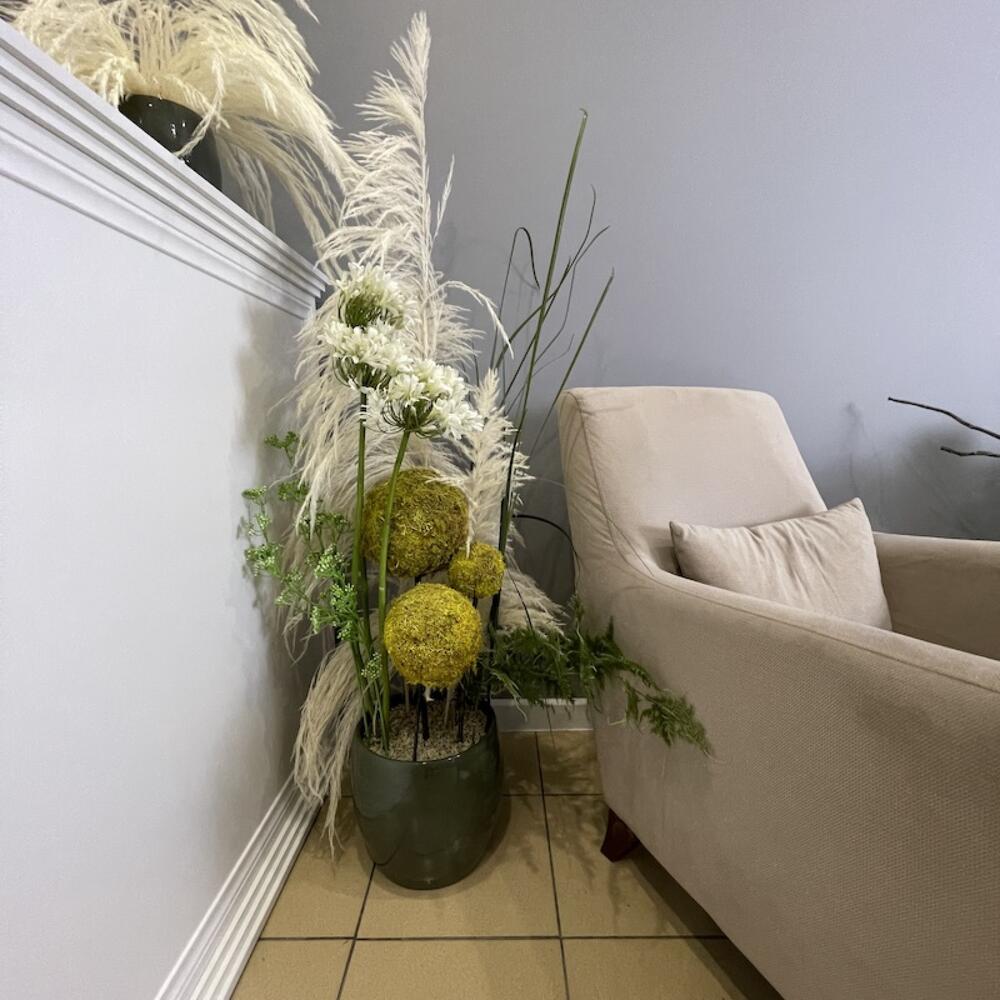 картадерия – 1 шт.агапантус искусственный – 3 шт.плюмозус искусственный – 2 шт.осока искусственная – 7 шт.шары из натурального мха – 3 шт.Кашпо керамика – 1 шт.