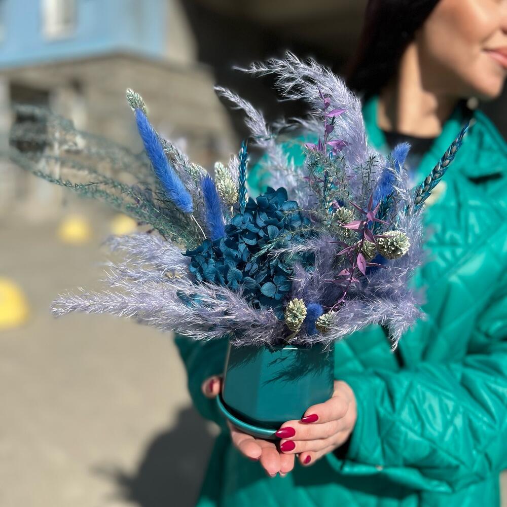 Гортензия – 1 шт.Пшеница – 6 шт.Лагурус – 10 шт.Кашпо керамическое – 1 шт.Фаларис – 16 шт.Оазис для сухоцветов – 1 шт.овес сухоцвет – 2 шт.кортадерия – 3 шт.мискантус – 1 шт.
