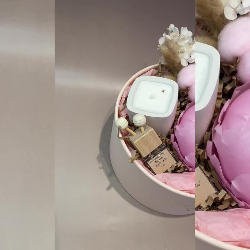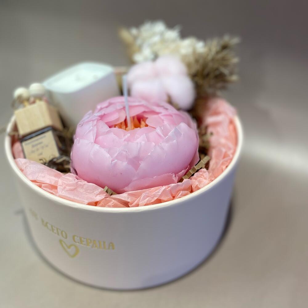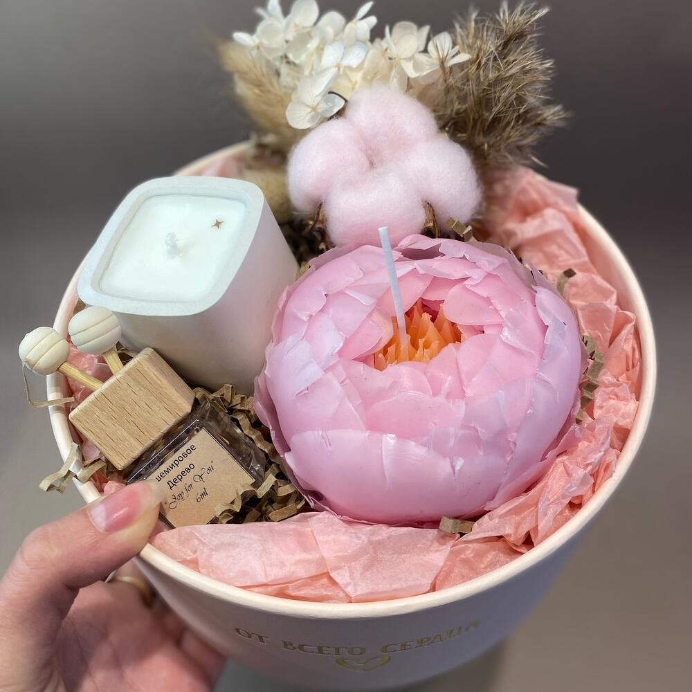 Хлопок – 1 шт.Тишью – 1 шт.Коробка – 1 шт.диффузор – 1 шт.гортензия стабилизированная – 1 шт.свеча в гипсовом стаканчике – 1 шт.свеча-пион – 1 шт.Лагурус – 3 шт.