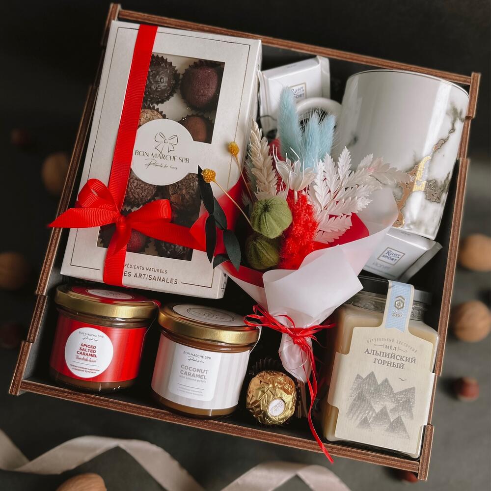 керамическая кружка – 1 шт.трюфельные конфеты – 8 шт.мед альпийский горный – 320 гр.кокосовая карамель – 1 шт.карамель «шведская булочка» – 1 шт.шоколад риттер спорт мини – 1 шт.конфета ферреро роше – 1 шт.букет сухоцветов – 1 шт.Деревянная коробка – 1 шт.оформление набора – 1 шт.