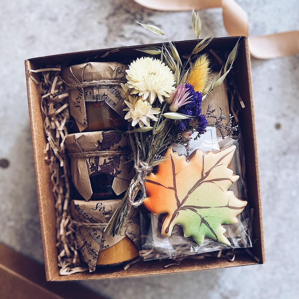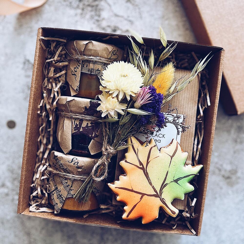 чай черный с чабрецом – 50 гр.Имбирный пряник ручной работы – 1 шт.соленая карамель с арахисом – 1 шт.арахисовая паста – 1 шт.клюквенный джем с грецким орехом – 1 шт.полевые сухоцветы микс – 1 шт.Открытка мини – 1 шт.Подарочная коробка – 1 шт.