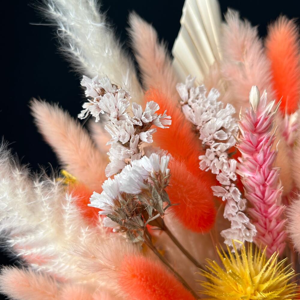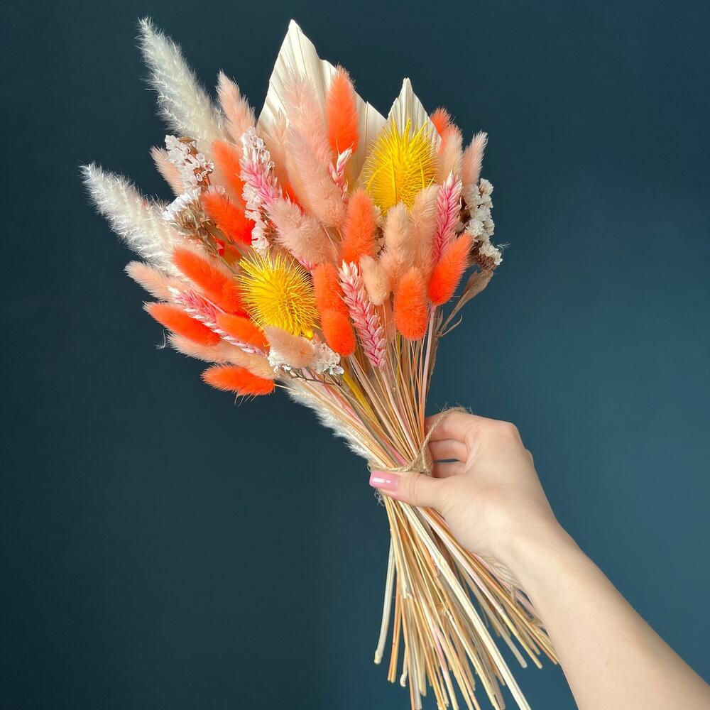 Яркий весенний букет из сухоцветов и стабилизированной статицейРазмер без упаковки: ~23*50Размер с упаковкой: ~25*50Букет из сухоцветов и стабилизированных цветов не завянет, а будет радовать несколько летСухоцветы не требуют трепетного ухода, ведь им не нужна вода, они не притягивают пыль, и сами не осыпаютсяК букету прилагается памятка, как сохранить внешний вид букета на несколько лет