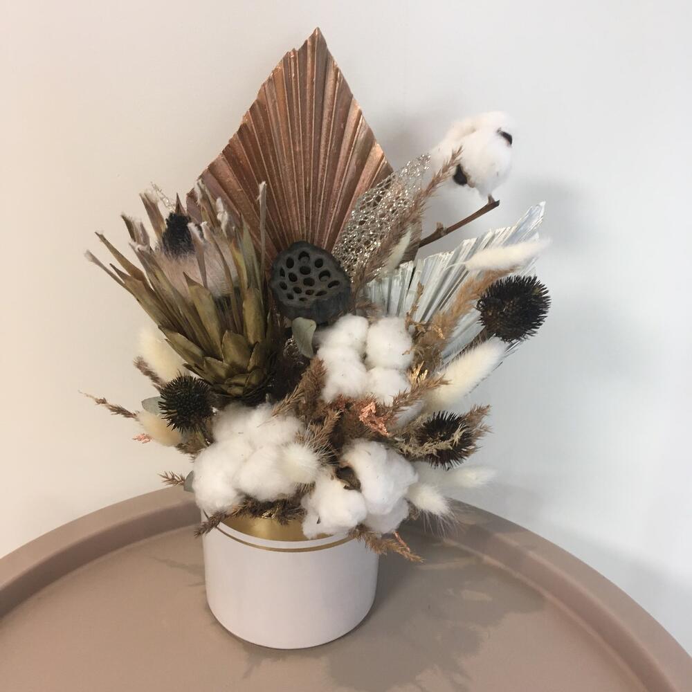 Хлопок натуральный – 5 шт.Лагурус (сухоцвет) – 15 шт.камыш – 11 шт.Протея – 1 шт.пальмы сухоцвет – 2 шт.Лотос сухой – 1 шт.Кашпо керамическое – 1 шт.