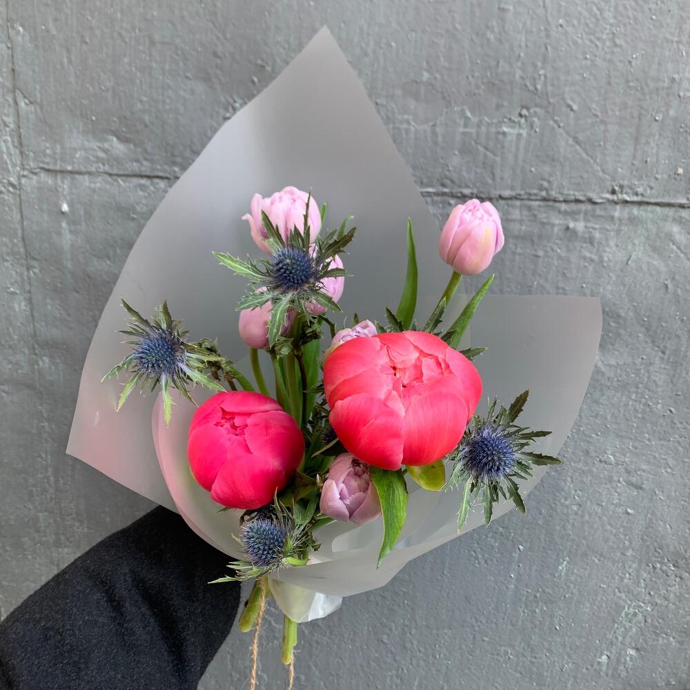 Авторский букет с пионами тюльпанами и эрингиумом / 1378 id