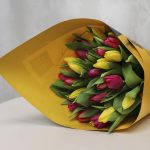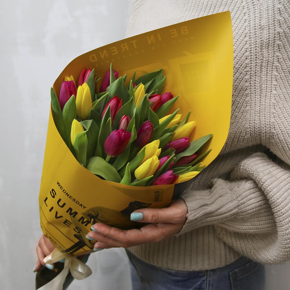 тюльпаны стандартные – 25 шт.Пленка – 1 шт.Лента – 1 шт.