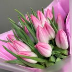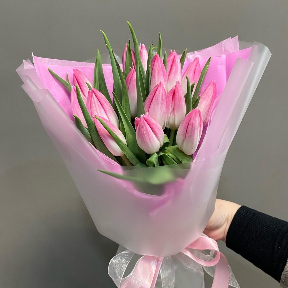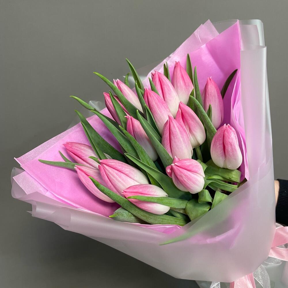 Тюльпан – 15 шт.Упаковка дизайнерская – 2 шт.ленты – 2 шт.