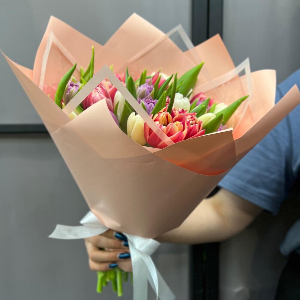 Тюльпан пионовидный – 20 шт.Тюльпан белый – 9 шт.Пленка матовая – 5 шт.Лента атласная – 2 шт.