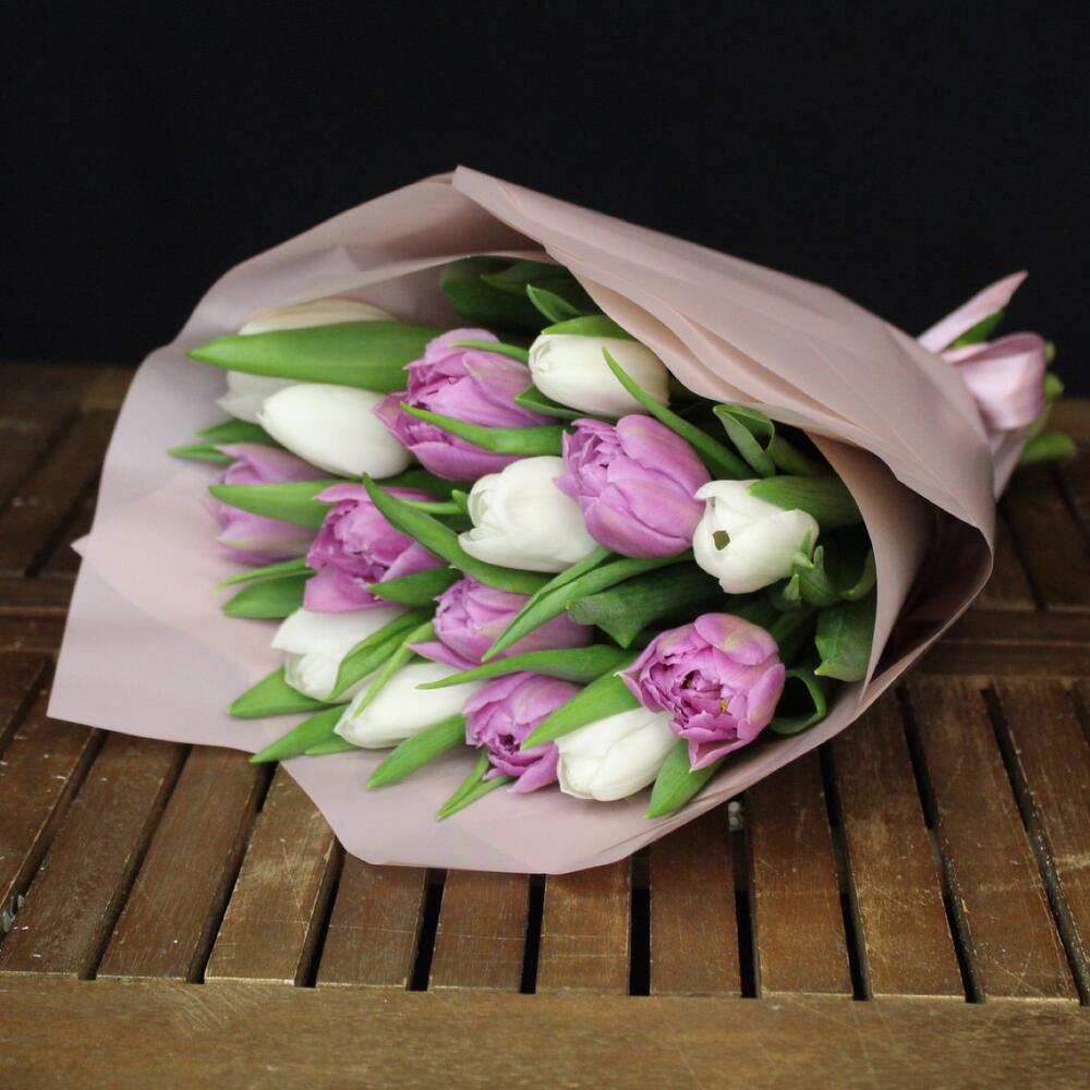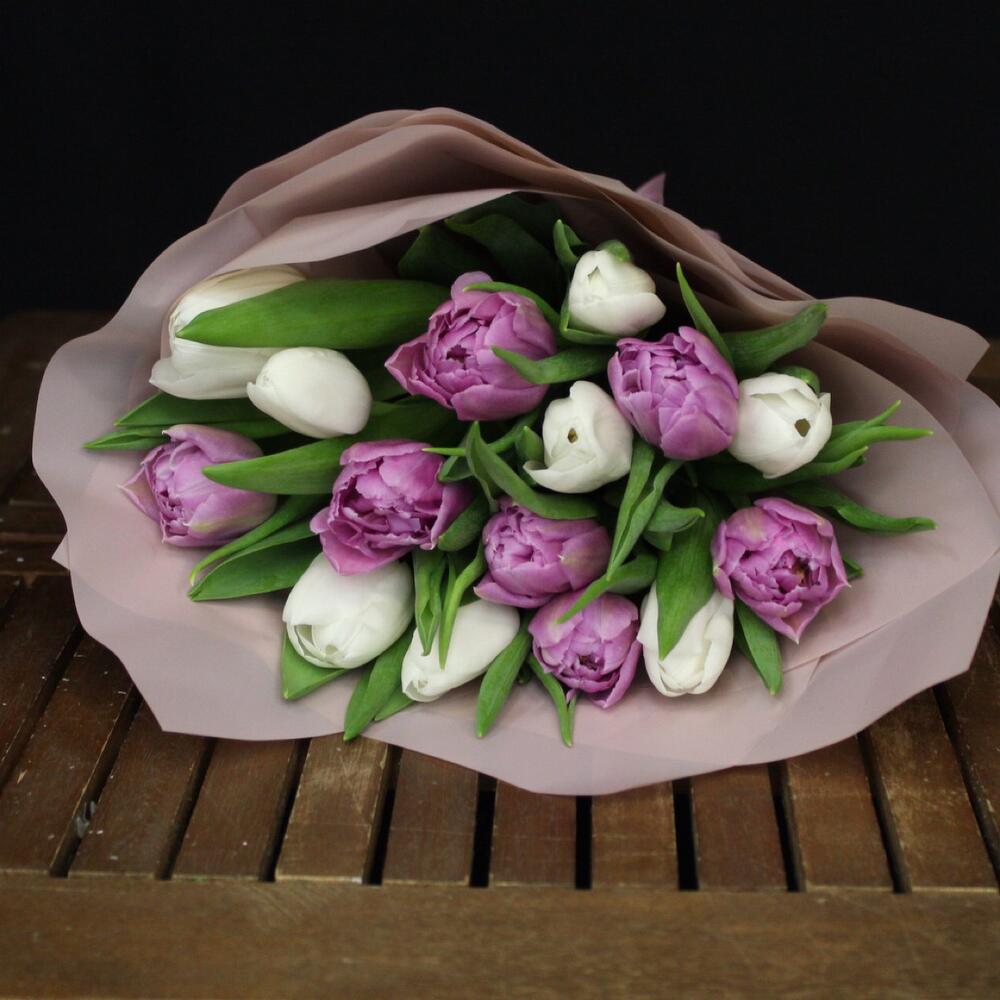 Тюльпан пионовидный – 7 шт.Тюльпан белый – 8 шт.Пленка матовая – 3 шт.Лента атласная – 1 шт.