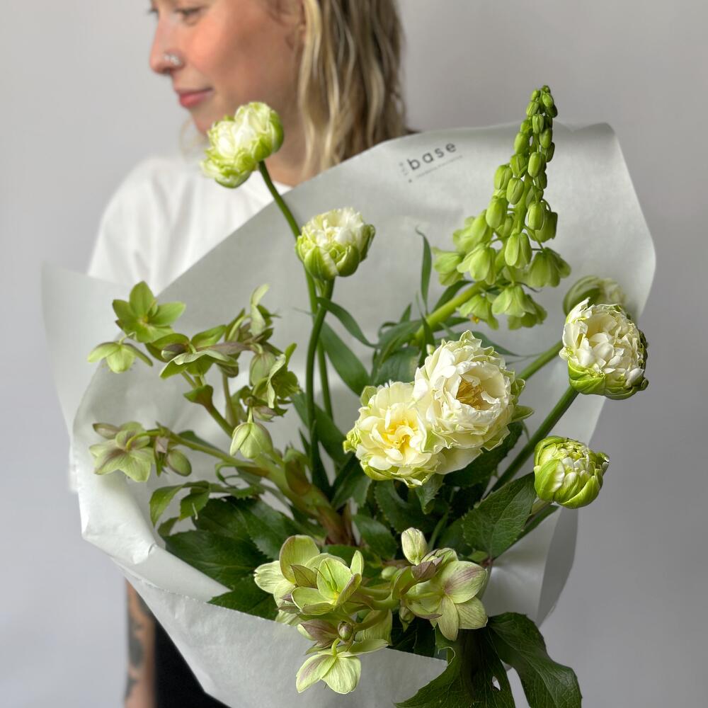 Небольшой зеленый букет из сезонных цветов
