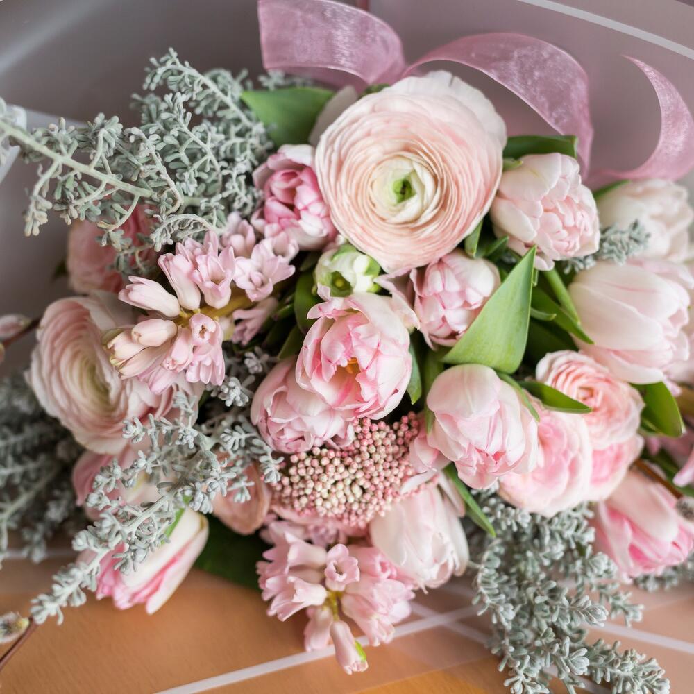 Верба – 3 шт.Гиацинт – 5 шт.Озотамнус – 3 шт.Ранункулюс – 4 шт.Тюльпан пионовидный – 15 шт.кустовые розы – 3 шт.