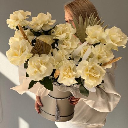 Цветы в коробке с пион розами,сиренью,ранункулюсами,эустомой,тюльпанами,матиолой,пионовидными кустовыми розами