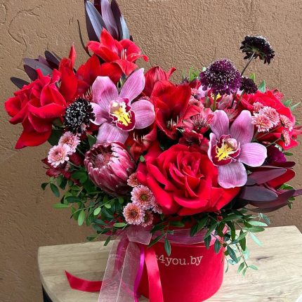 Цветы в коробке с гортензией,пион розами,матиолой,альстромерией,эустомой,колосьями пшеницы и эвкалиптом